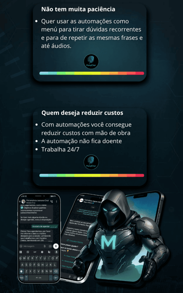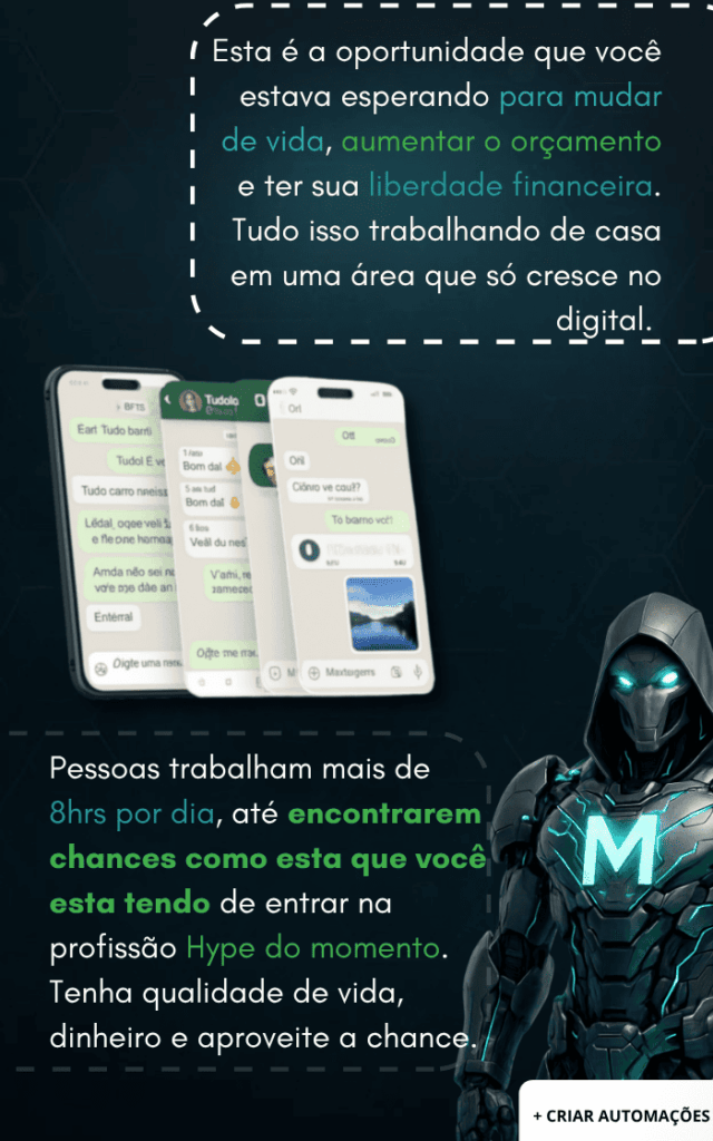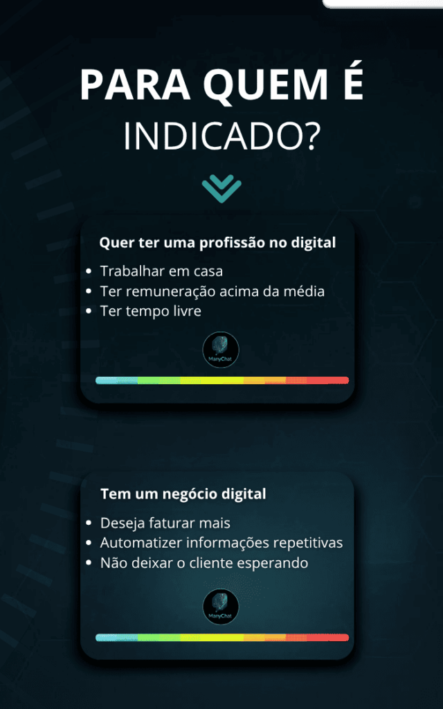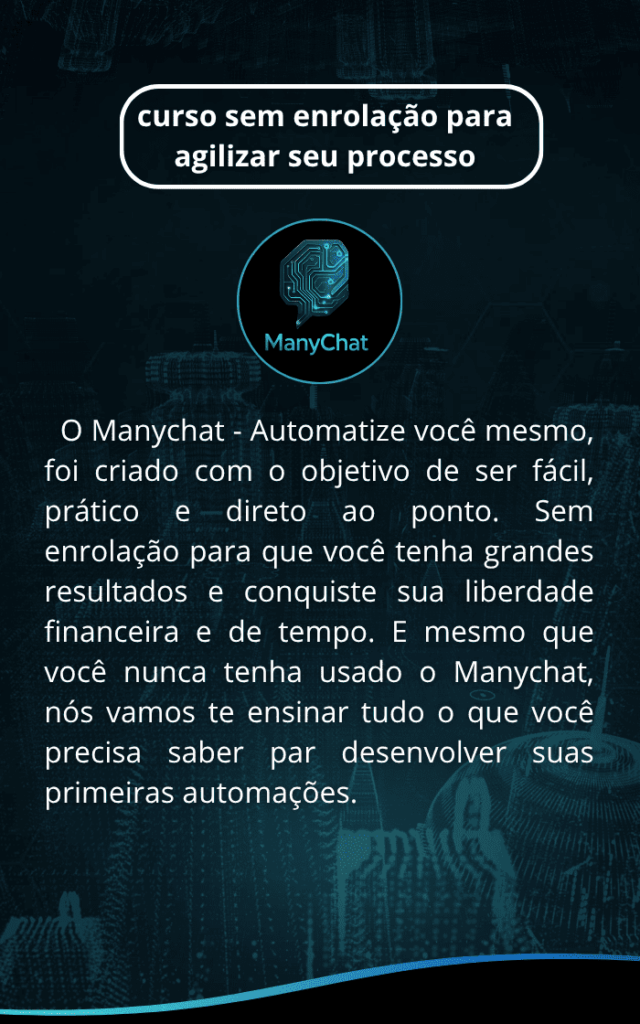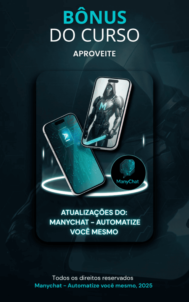 Porque automação é o presente e o futuro dos negócios. Quem domina o ManyChat hoje tem uma vantagem enorme sobre a concorrência: vende mais, com menos esforço e menos custo. No curso, você aprenderá exatamente como transformar conversas em vendas no automático.